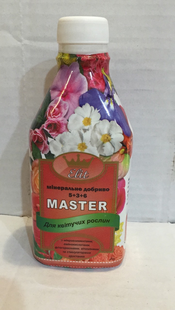Комплексне добриво Master (Майстер) Еліт, 0,3 л, Квітучі — високоефективне багатокомпонентне мінеральне добриво для кореневого підживлення квітучих рослин: Агератам, Афеляндра, Бальзамін, Бегонія, Врігія, Гарденія, Камелія, Калумнея, Лобелія, Петунія, Сурфінія, Спатифілум, Стефанотіс, Фуксія, Фіалка, Хвоя, Цикламен, лукові однорічні та багатовронні рослини.